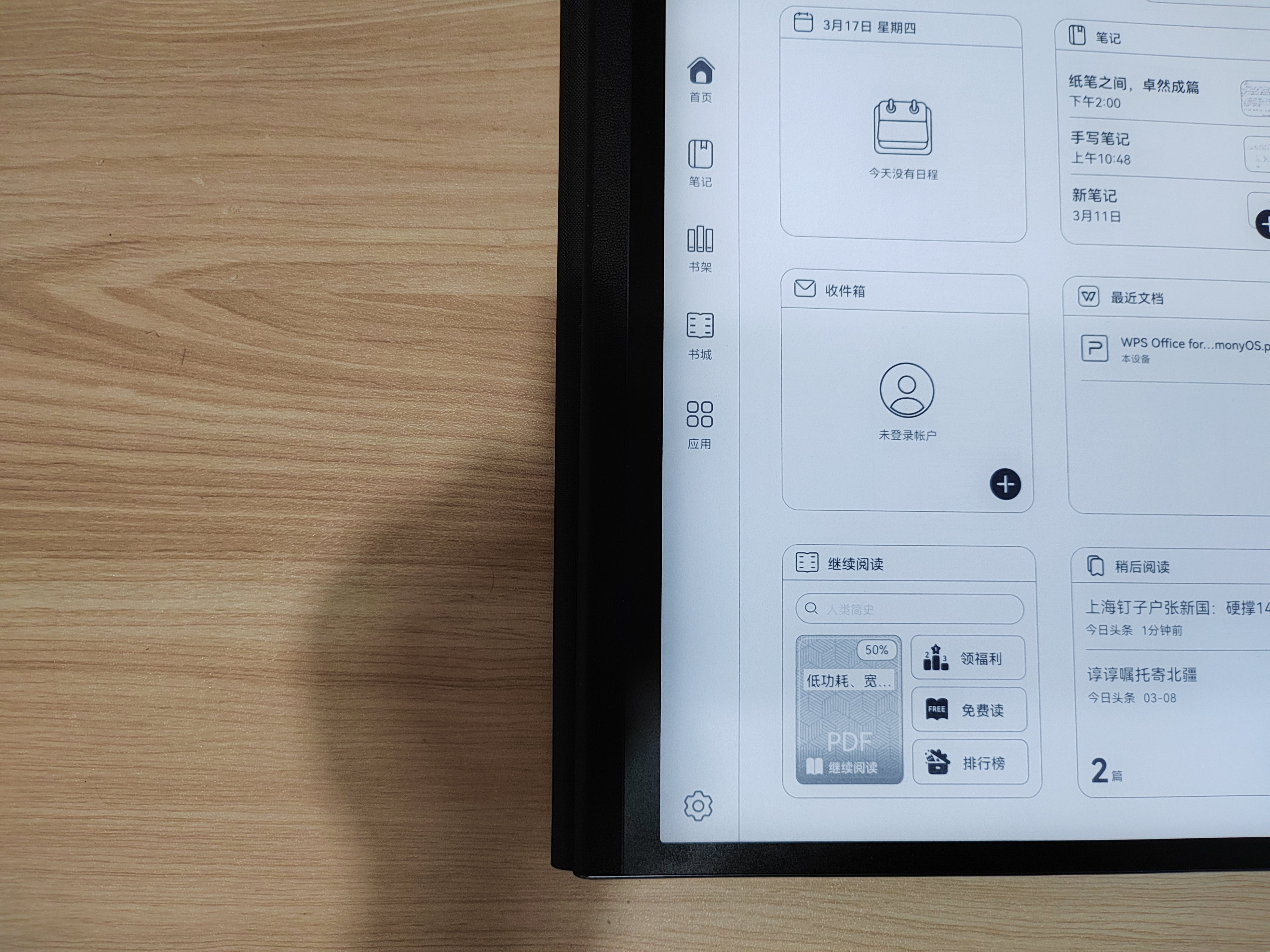 主页的设计干净简约,线条较少。左侧一栏是功能选项,笔记、书城、书架、应用这些常用的功能,最近阅读过的图书、文档和日程安排、邮件通知都在主页显示,一步就能触达想要打开的应用。
