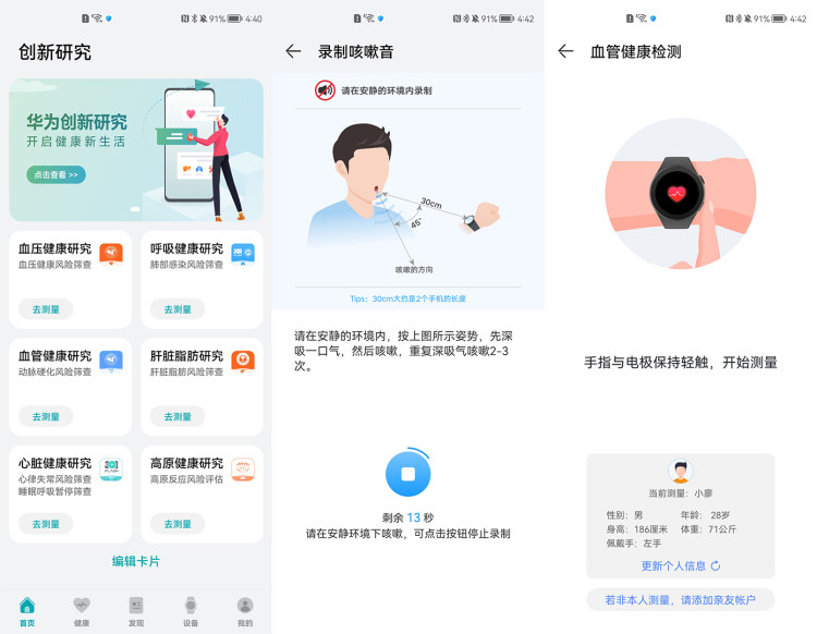 举个例子,在后续的GT系列以及最新产品中,华为Watch已经支持向麦克风吹气来判断是否有呼吸道疾病、通过ECG心电图监测来判断血管的软硬化程度,这些功能都随着华为创新实验室中不断加入的快捷应用来不断进行更新。除此以外,华为健康也通过体脂称、血压手表等其他设备来获得对肝脏、血压的监测。